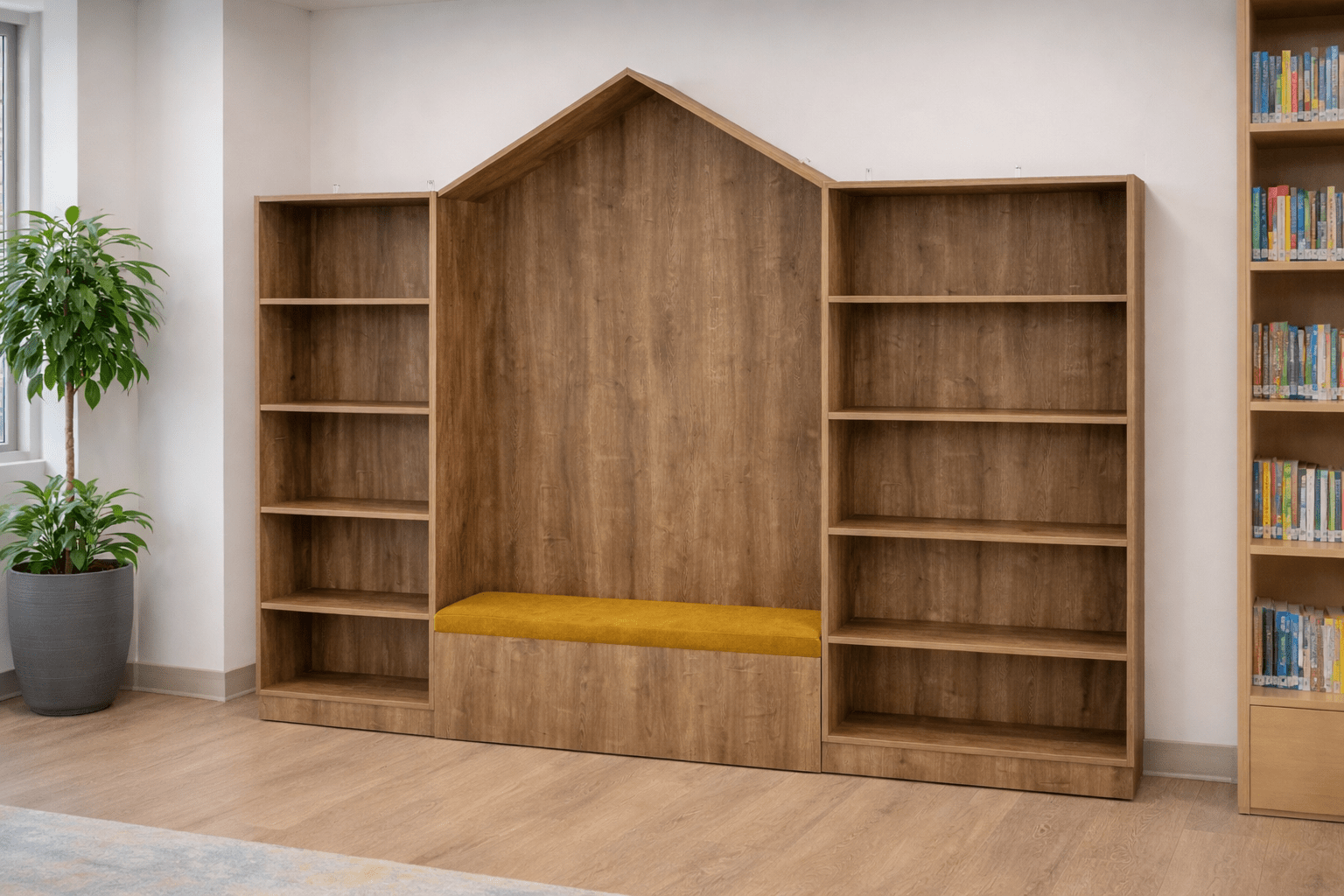 בית עץ מעוצב משלוב פינת ישיבה וספרייה משני הצדדים
