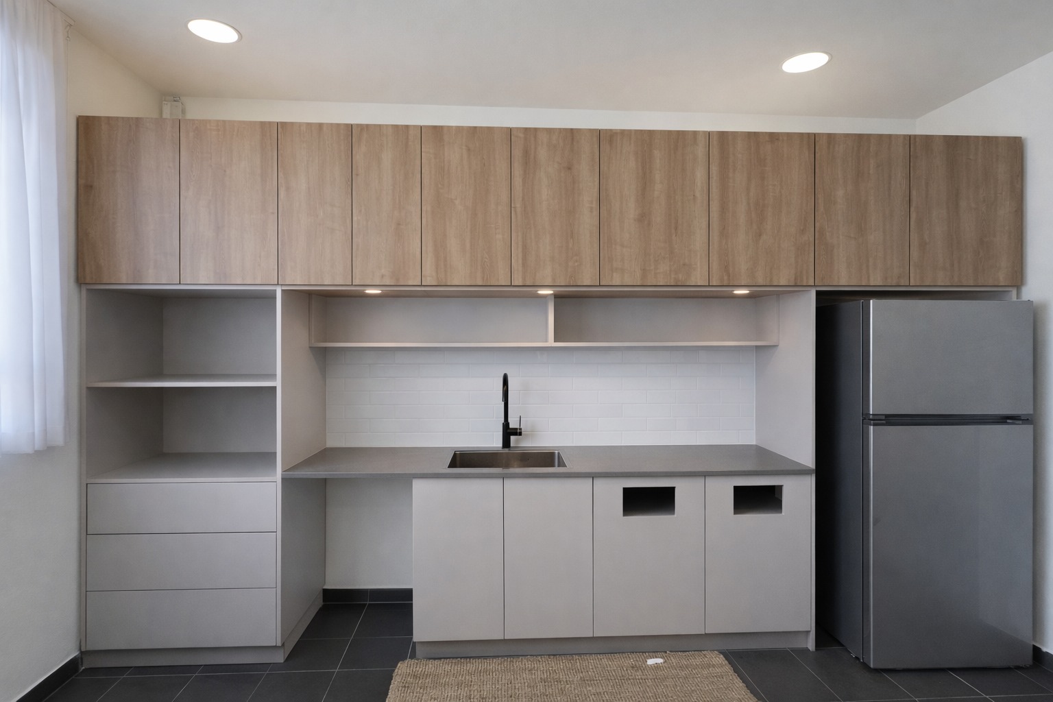 המטבח כולל משטח עבודה רחב, כיור אינטגרלי בעיצוב מודרני, פתרונות אחסון חכמים ותכנון פונקציונלי המותאם לשימוש יומיומי אינטנסיבי.