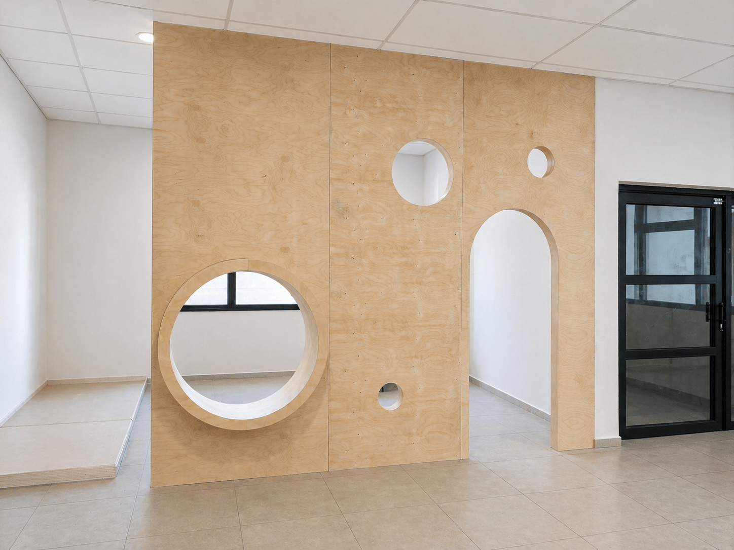 קיר פעילות ייחודי בעיצוב מודרני, המשלב פתחים גיאומטריים וקשת מעבר ליצירת חלל פתוח, נעים ומעורר השראה.